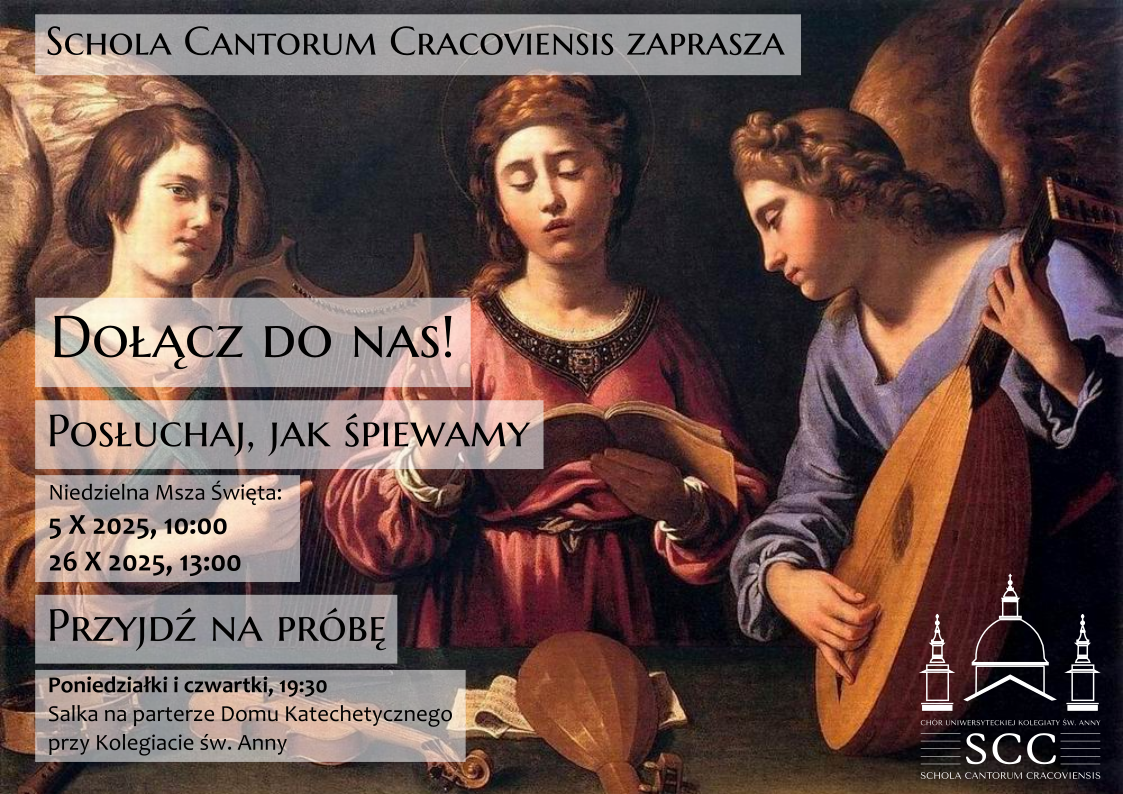 Chór naszej Kolegiaty Schola Cantorum Cracoviensis serdecznie zaprasza na próby wszystkich, którzy chcieliby spróbować swoich sił w śpiewie chóralnym. Wykonywane utwory ćwiczymy wspólnie na próbach w poniedziałki i czwartki o 19:30 w salce na parterze domu katechetycznego przy Kolegiacie. Chór można usłyszeć w Kolegiacie na niedzielnych mszach świętych. Najbliższa okazja będzie 5 października o godzinie 10:00 i 26 października o 13:00.